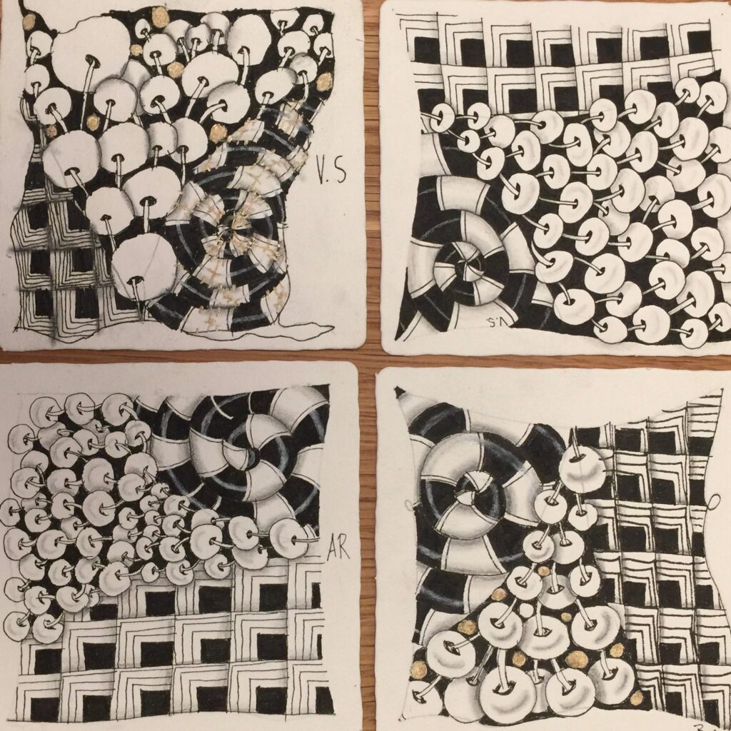 Kinder lieben es zu tanglen! Mädchen und Knaben gleichermassen. Das fokussierte Zeichnen fördert die Konzentration, die Motorik und die Kreativität! Auch mit den Kindern beginnen wir mit dem klassischen Schwarz auf Weiss, nehmen aber bald Farben hinzu. Während des Zeichnens werden einige wichtige Bestandteile der Zentangle-Philosophie vermittelt und sobald die wichtigste Botschaft: “ Es gibt keine Fehler – hier kannst du nichts falsch machen!“ angekommen ist, verschwinden auch die letzten Bedenken und Zweifel. Je nach Vorliebe des Kindes werden Tangles gelernt, nachgezeichnet und es entstehen bald auch neue Kombinationen, Variationen und eigene Muster!