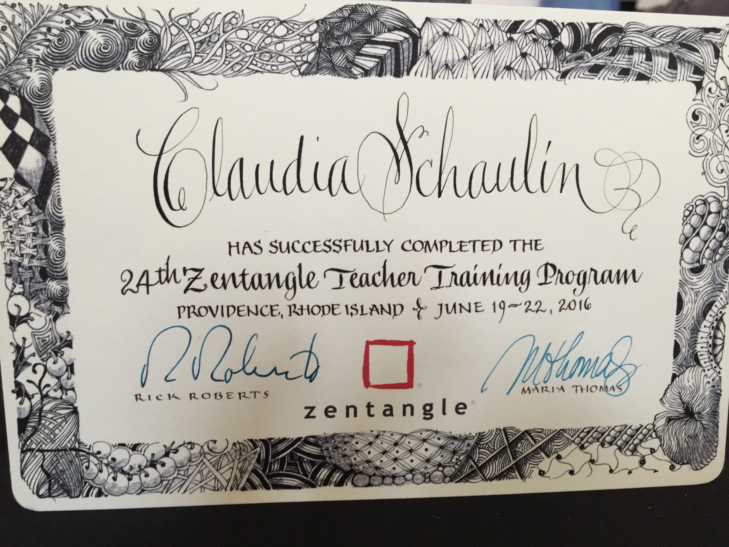Kurz nachdem ich Zentangle® kennengelernt hatte, besuchte ich einen Basiskurs in Zürich und schon bald danach flog ich in die USA, um mich bei den Gründern von Zentangle®, Maria Thomas und Rick Roberts, als Zentangle® Lehrerin zertifizieren zu lassen. Seither gebe ich regelmässig Kurse und monatliche Treffen, baue Zentangle® in meinen Schulunterricht ein, gestalte Workshops in Projektwochen und tangle für mein eigenes Wohlbefinden fast täglich.